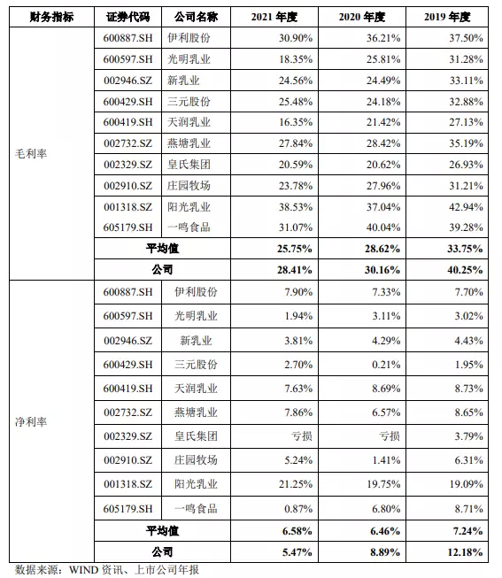 報告期內,認養(yǎng)一頭牛的整體毛利率從40.95%下滑至28.86%,不過仍高于行業(yè)平均值。