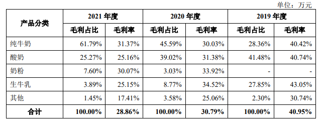 財報顯示,整個2021年純牛奶、酸牛奶、奶粉和生牛乳的銷售額分別為9.8億、5.45億、1.28億和0.84億,占比分別為54.84%、30.49%、7.17%和4.69%。