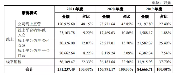 從銷售渠道來看,天貓超市、愛庫存和京東自營等線上渠道是認養(yǎng)一頭牛的核心陣地,占比達到7成以上。財報顯示,2019年至2021年認養(yǎng)一頭牛的線上銷售收入分別為5.27億元、12.46億元、19.51億元,占收入比例分別為62.30%、77.50%和77.67%。
