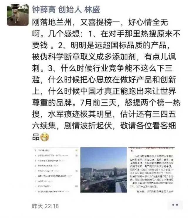 另一方面,一張疑似鐘薛高創(chuàng)始人林盛的朋友圈截圖在網(wǎng)上瘋傳,相關(guān)言論也在加劇網(wǎng)絡(luò)負(fù)面情緒的蔓延。直到目前,盡管鐘薛高連發(fā)兩次聲明,但市場(chǎng)的憤怒依然未能消解。