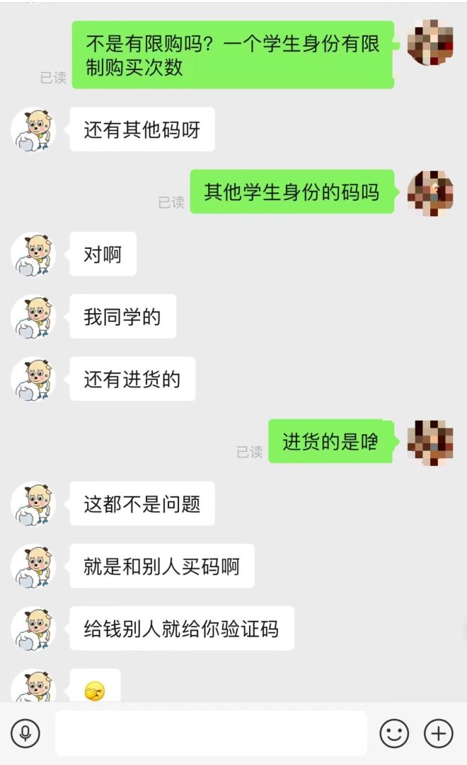 “有同學(xué)給的,也有從別人那里買的”,上述店鋪客服如此回復(fù),他把成批的買碼稱為“進貨”。