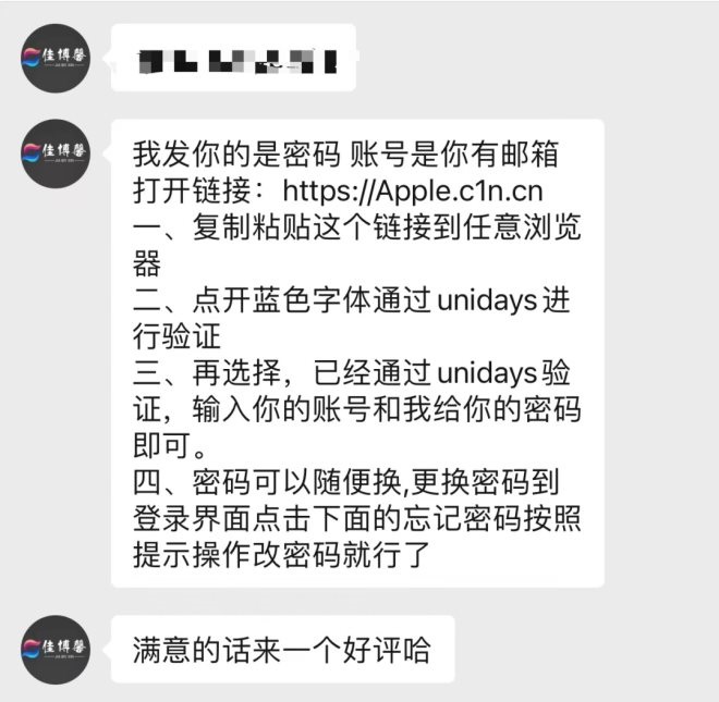 該店鋪針對認證商品提供兩種選擇,一種是10元可購買蘋果官網(wǎng)一次性認證,20元則可以獲得為期一年的資格認證。支付成功之后,對方要求提供一個未注冊UNiDAYS的郵箱,隨即便發(fā)來密碼和操作流程。