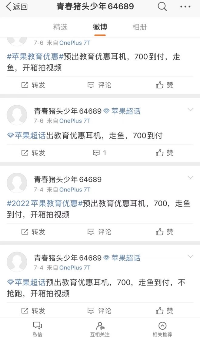 在微博的“蘋果超話”頁面,很多網(wǎng)友都像小吳一樣,正在預(yù)售教育耳機,價格在650-700元之間!霸趺茨芡ㄟ^蘋果教育認證”,眼看著有羊毛可薅,有人也打起了教育資格認證主意。