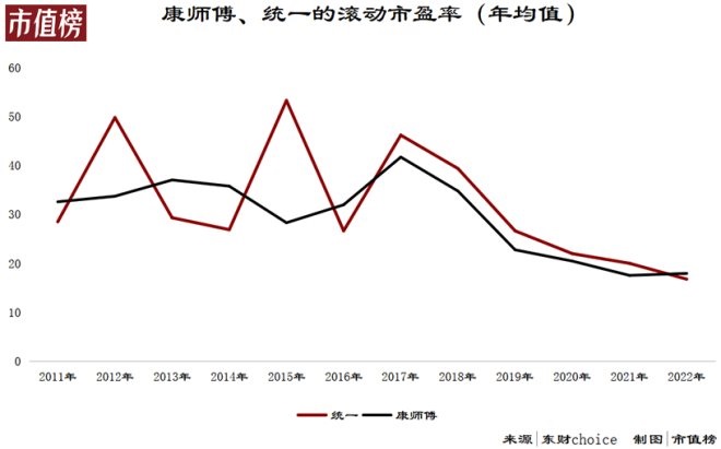先看港股上市的兩家,康師傅和統(tǒng)一,雖然都包含飲料之外的業(yè)務(wù),但不妨做一個(gè)參考。