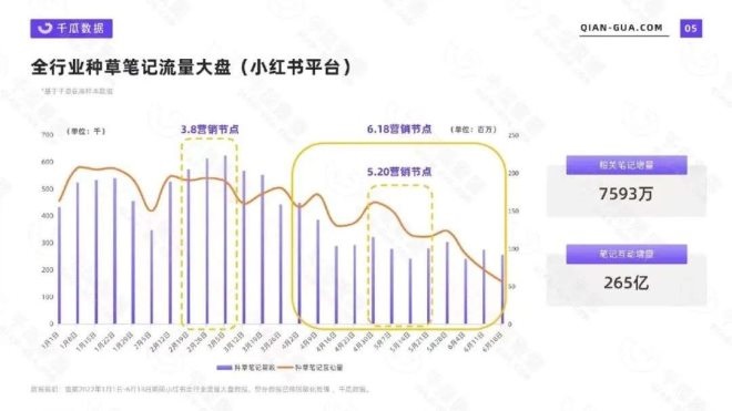 果集·千瓜數(shù)據(jù)顯示,2022上半年,小紅書(shū)行業(yè)流量數(shù)據(jù)依舊亮眼, 各大品牌相互角逐,經(jīng)歷三八婦女節(jié)、520、618等各大營(yíng)銷節(jié)點(diǎn),累積種草筆記7593萬(wàn)篇,創(chuàng)造出近265億互動(dòng)總量。