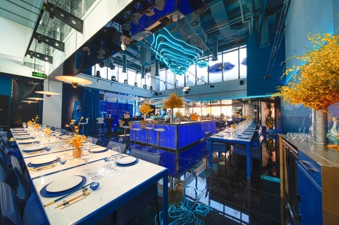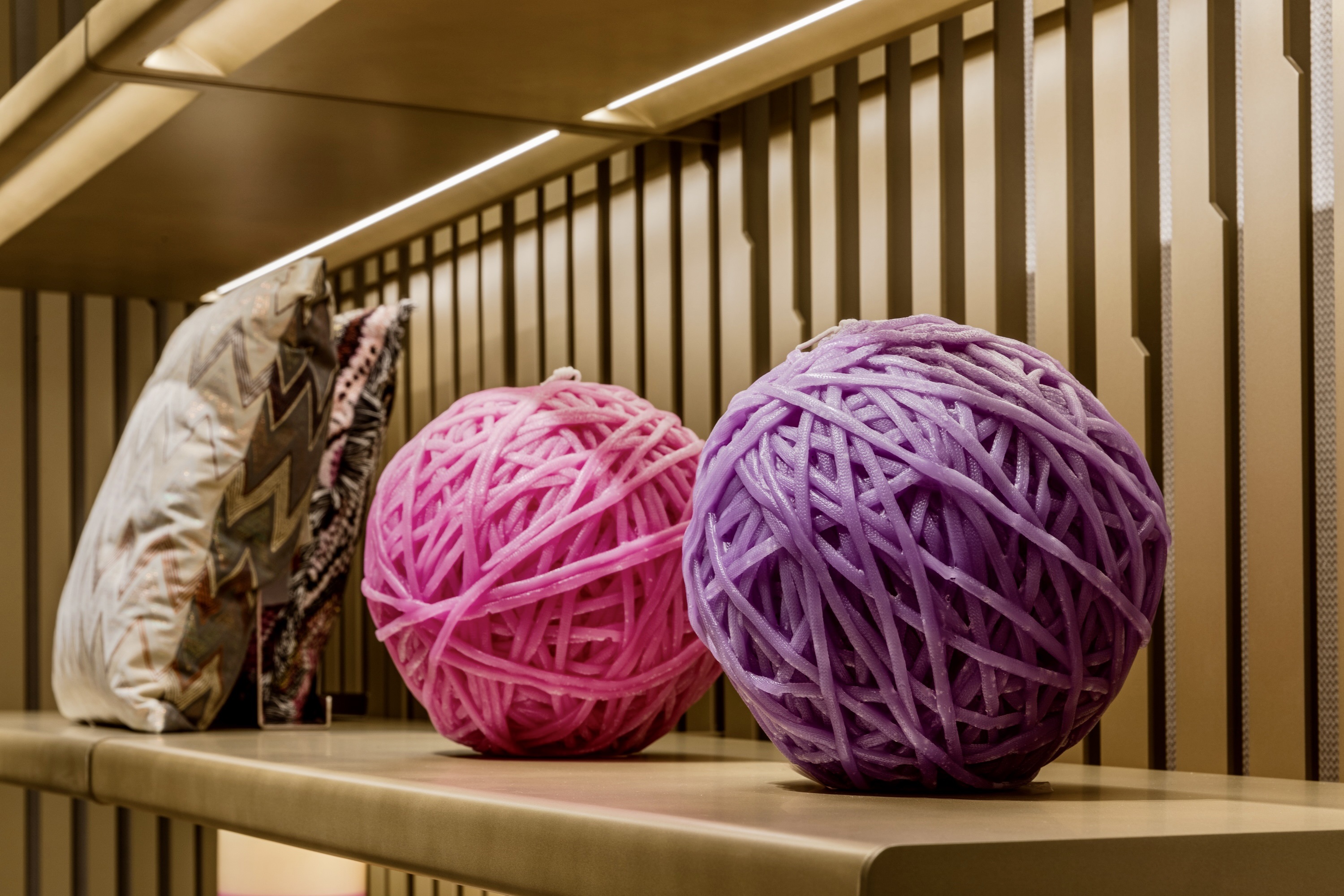 該店外墻延續(xù)以往門店特色,使用標志性的之字形圖案串聯(lián)起垂直金屬、色彩、光線三個元素,科技感撲面而來。店內產品按照顏色整齊擺放,貨架上偶也擺放色彩鮮艷的毛球加以點綴,給店鋪增加了生機和活力。