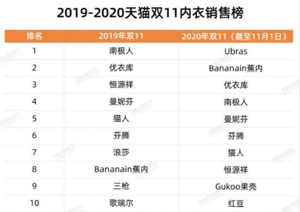 一眾新銳品牌,打破過(guò)往的“鋼圈內(nèi)衣”設(shè)計(jì),通過(guò)無(wú)鋼圈、無(wú)尺碼彎道超車(chē),最終實(shí)現(xiàn)了后來(lái)居上。據(jù)公開(kāi)資料,2019年天貓雙11內(nèi)衣銷(xiāo)售榜上,前五名的品牌分別為南極人、優(yōu)衣庫(kù)、恒源祥、曼妮芬、貓人,均為傳統(tǒng)內(nèi)衣品牌,可見(jiàn)在當(dāng)時(shí)鋼圈內(nèi)衣仍是市場(chǎng)的主流。