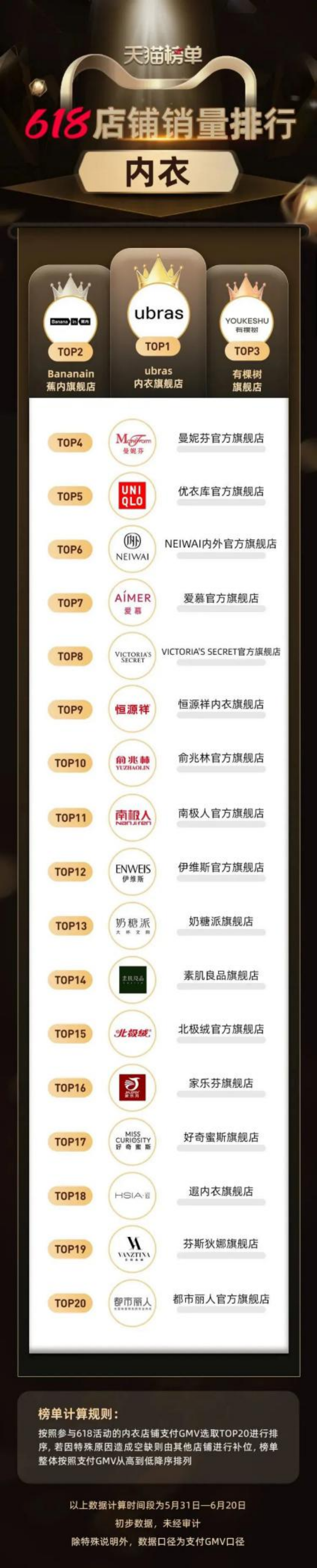 今年618天貓內(nèi)衣品類(lèi)的銷(xiāo)量排行榜中,新銳內(nèi)衣品牌仍然搶跑在前,位列前三的品牌分別為蕉內(nèi)、ubras、有棵樹(shù),均是新銳內(nèi)衣品牌。