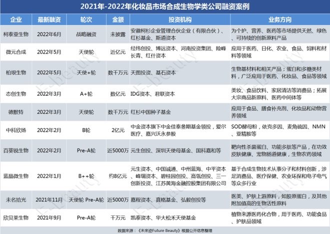 包括藍晶微生物、態(tài)創(chuàng)生物、中科欣揚、微元合成等案例在內(nèi),這已經(jīng)是近一年來,涉足化妝品領(lǐng)域的第10起合成生物學公司的融資,共吸納超過16億元人民幣資金。
