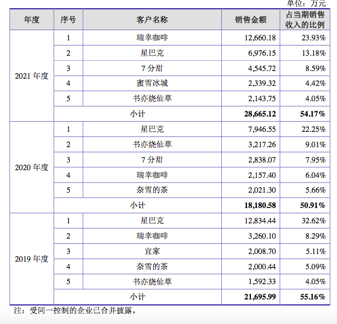 與此同時,德馨食品抓住了新式茶飲的東風。2019年,瑞幸、奈雪、書亦燒仙草,這三家大客戶貢獻的銷售額占比為17.43%,2021年,瑞幸、奈雪、書亦燒仙草 、7分甜貢獻的達到了40.99%。