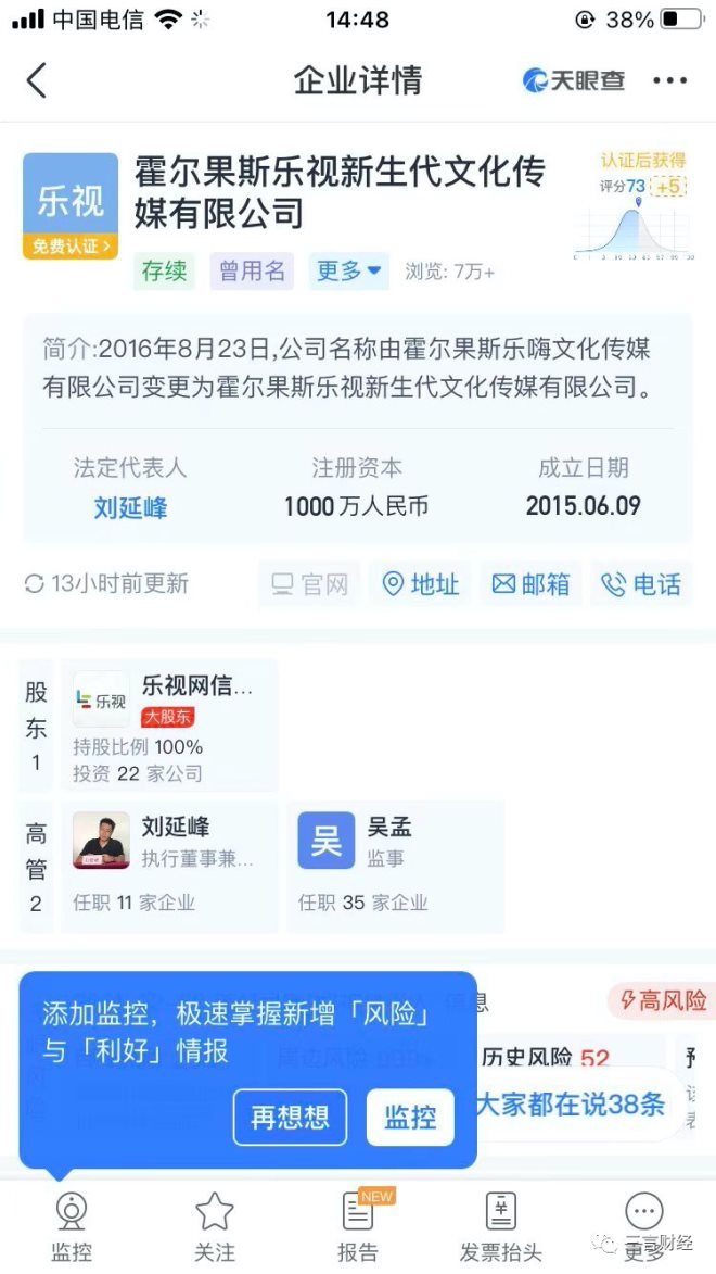 天眼查顯示,樂(lè)視新生代(北京)文化傳媒有限公司是霍爾果斯樂(lè)視新生代文化傳媒有限公司的全資子公司。