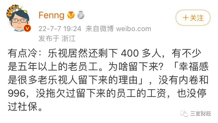7月7日,在微博擁有200多萬(wàn)粉絲的博主 @Fenng 發(fā)文稱“樂(lè)視居然還剩下400多人,有不少是五年以上的老員工。為啥留下來(lái)?「幸福感是很多老樂(lè)視人留下來(lái)的理由」,沒(méi)有內(nèi)卷和 996,沒(méi)拖欠過(guò)留下來(lái)的員工的工資,也沒(méi)停過(guò)社!薄