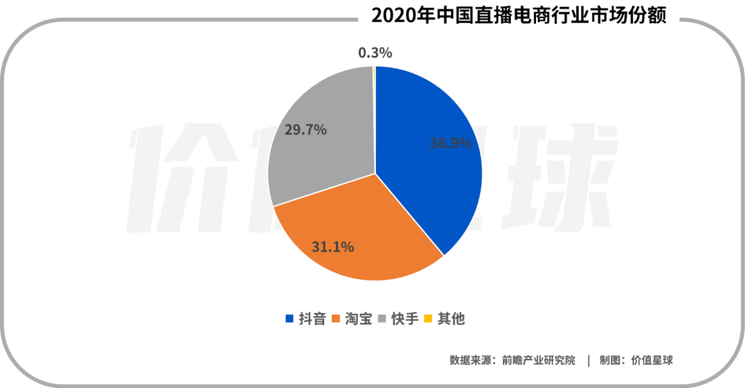 如果只看直播電商領(lǐng)域,國(guó)內(nèi)直播電商市場(chǎng)格局已呈現(xiàn)“三分天下”的局面,其中抖音、淘寶、快手的市占率分別為38.9%、31.1%和29.7%(2020年底數(shù)據(jù))。