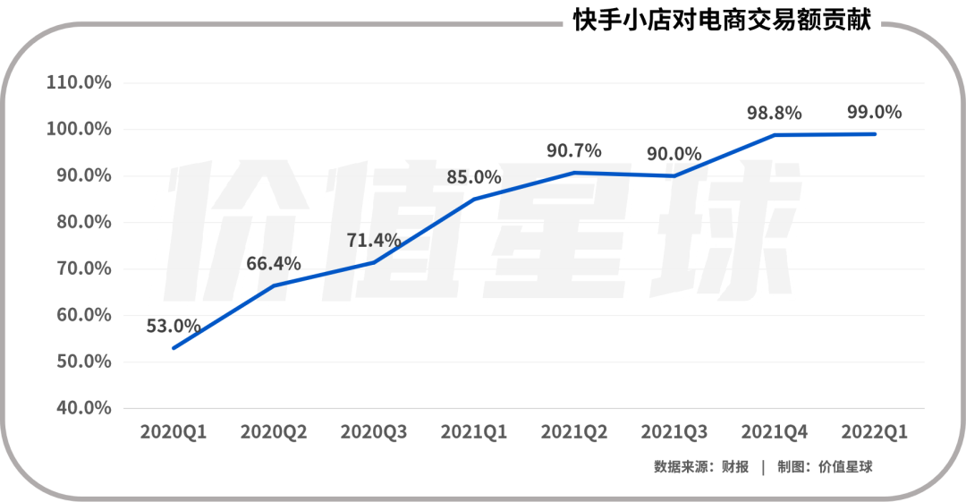 財(cái)報(bào)顯示,快手小店對(duì)快手電商交易額的貢獻(xiàn)率已經(jīng)從2020年Q3的71.4%增加至2021年Q3的 90%,2021年Q4達(dá)到了98.8%,2022年Q1進(jìn)一步達(dá)到99%。