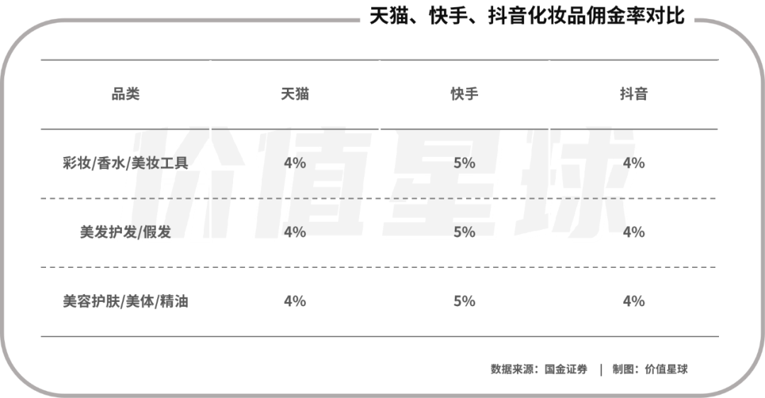 現(xiàn)階段抖音、淘寶、快手在化妝品品類上的傭金率基本都在4%-5%之間,故單個(gè)產(chǎn)品的價(jià)值越高,平臺(tái)所獲得的傭金就越高(假定補(bǔ)貼力度和退貨率一定的前提下)。
