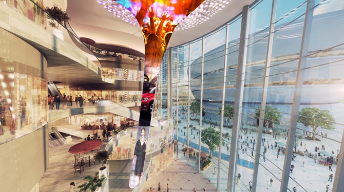 科技城市生長(zhǎng)樹:由柔性LED屏組成的約37米的城市生長(zhǎng)樹,可播放商業(yè)活動(dòng)廣告和演藝中心演唱活動(dòng),可以增強(qiáng)商場(chǎng)、品牌及消費(fèi)者間的聯(lián)動(dòng)。