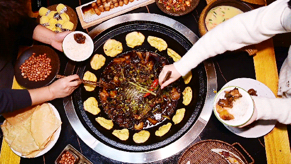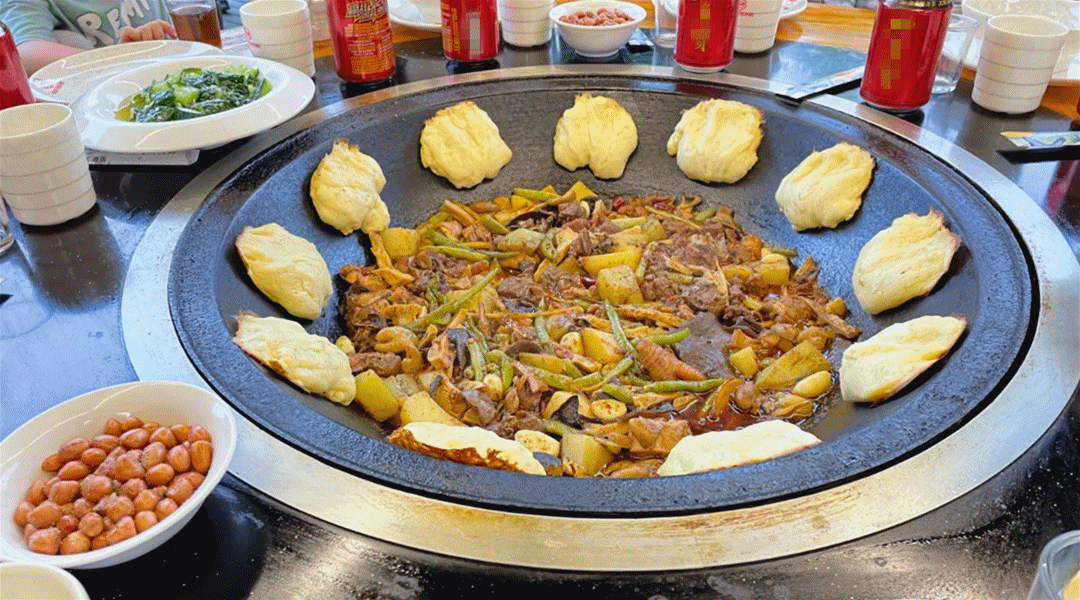 找到第二家稍小點(diǎn)的柴火雞店,我們勉強(qiáng)排上了號(hào)。標(biāo)志性的大鐵鍋加上熊熊燃燒的柴火,員工當(dāng)場(chǎng)現(xiàn)炒,非常有煙火氣。