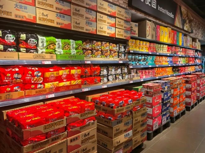正在店內(nèi)可以看到,各類生鮮都有預(yù)包裝,不少水果、零食按箱售賣。
