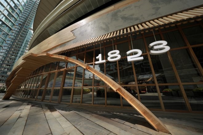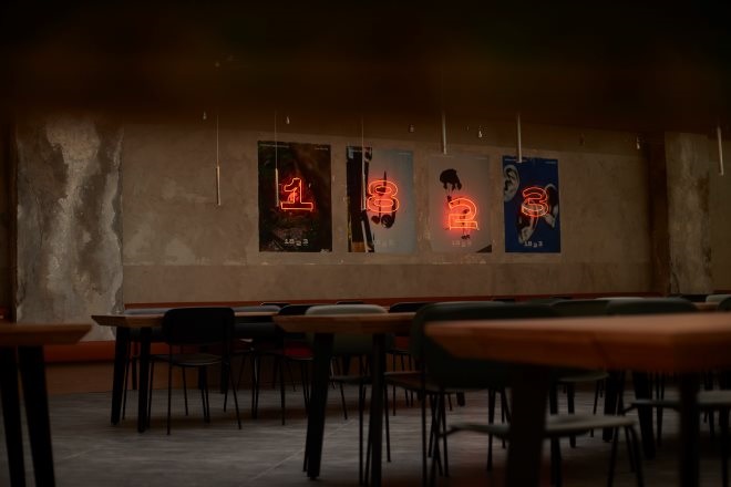 首店外墻由玻璃和木條構(gòu)成,整齊簡(jiǎn)潔;內(nèi)部就餐區(qū)墻壁上掛著四幅畫像,畫像上依次懸掛著“1823”四個(gè)數(shù)字霓虹燈牌,與灰咖色墻壁形成反差;藏酒區(qū)位于首店正中央,各色各樣的酒整齊擺放成酒墻形成穹頂之狀,非常壯觀;餐飲制作區(qū)以竹墻巧妙隔開,又非常具有特色。