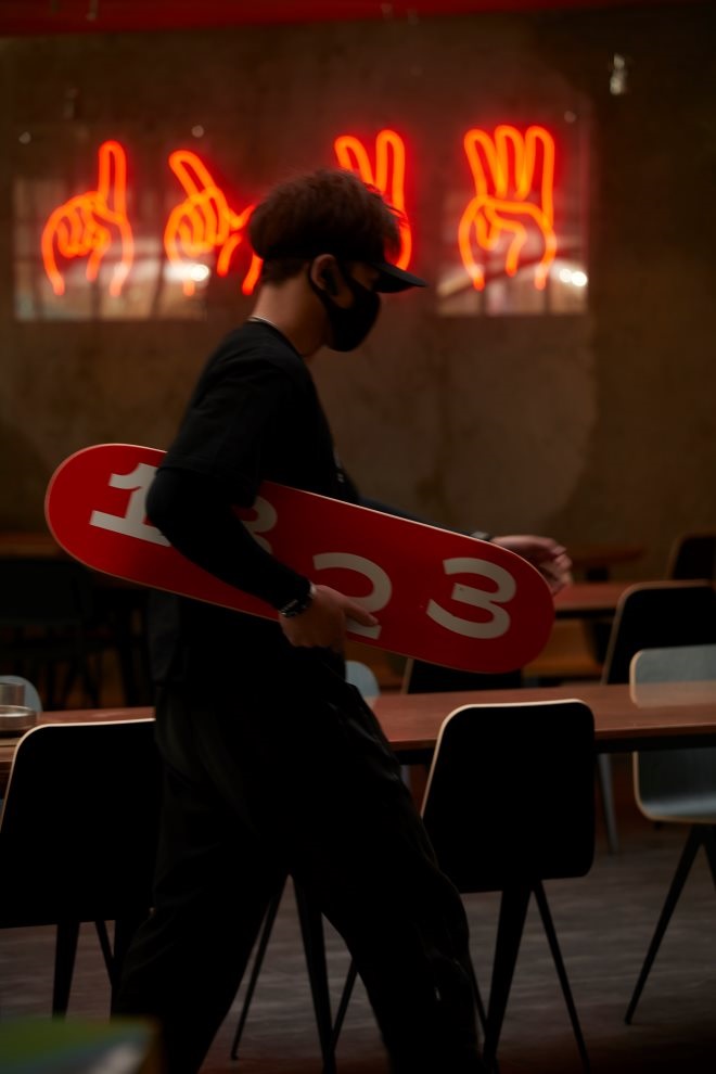 店內(nèi)充滿了潮流元素,墻壁懸掛著霓虹燈牌,上菜容器采用滑板形狀,店員統(tǒng)一佩戴黑色空頂帽。