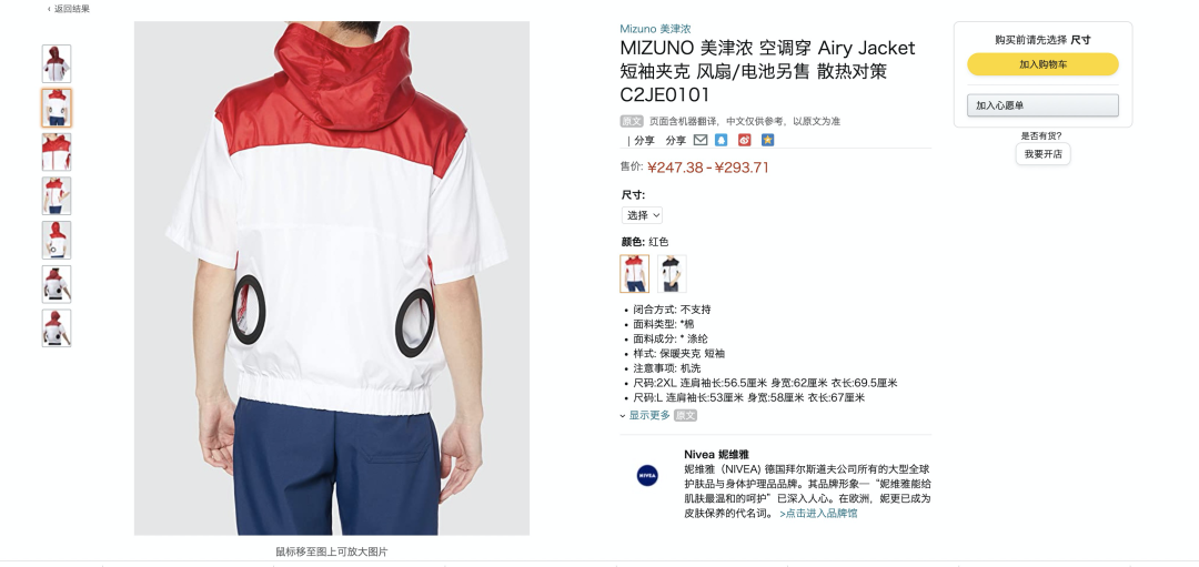 “風神”是日本空調(diào)服市場的成熟品牌,亞馬遜上,其產(chǎn)品定價在400—800元之間。較之國內(nèi),日本空調(diào)服市場在標準化、品牌化上都更為領先。甚至,日本運動品牌美津濃,也針對性地推出了預留風扇孔的空調(diào)服夾克衫,起售價約240元人民幣。