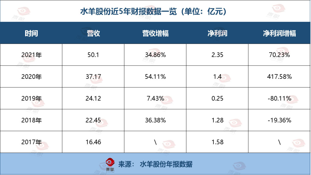 在這種模式下,水羊股份很快扭轉(zhuǎn)了局面。青眼梳理水羊股份財報發(fā)現(xiàn),該公司的營收從上市前的16.46億元(2017年)一路增加至2021年的50.10億元,5年間業(yè)績增長了2倍。
