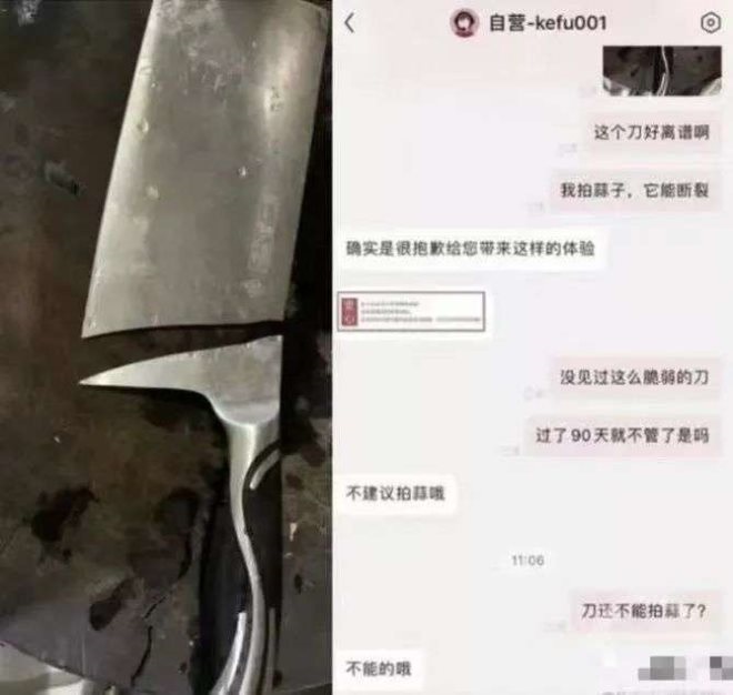 近日,廣州一名消費(fèi)者用張小泉菜刀拍蒜,不料竟把刀拍裂了。帶著疑惑,她向張小泉菜刀售后客服咨詢,卻得到了“菜刀不能拍蒜”的答復(fù)。隨后,該消費(fèi)者將經(jīng)歷在網(wǎng)上發(fā)出,引發(fā)全網(wǎng)熱議。