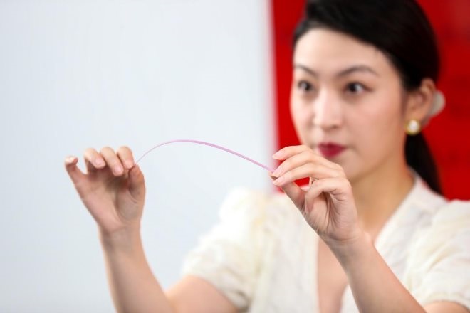 主持人在展示恩施來鳳面條的韌性。 攝影 和際