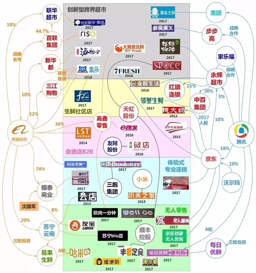 曾經(jīng)百花齊放的新零售江湖,可以畫出一張業(yè)務布局圖譜。到現(xiàn)在才幾年時間,圖中涉及的這些品牌,有的在熱潮退卻后降低預期,有的因業(yè)績下滑而收縮戰(zhàn)線,甚至有好幾家早已消失于風雨之中。