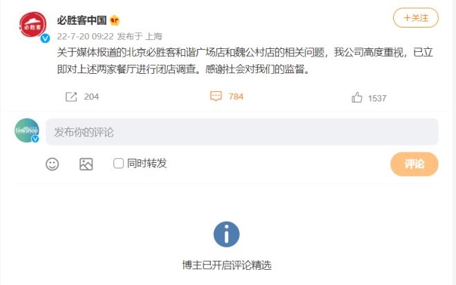 對此,必勝客中國微博回應(yīng)稱,關(guān)于媒體報道的北京必勝客和諧廣場店和魏公村店的相關(guān)問題,我公司高度重視,已立即對上述兩家餐廳進行閉店調(diào)查。感謝社會對我們的監(jiān)督。