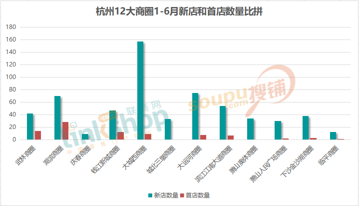 (6)從商圈角度看,由城西銀泰城、西溪印象城、龍湖杭州西溪天街三大主力商場(chǎng)組成的大城西商圈在過(guò)去6個(gè)月里品牌更新最為頻繁,共計(jì)開(kāi)出157家新店。其次是由大悅城和遠(yuǎn)洋樂(lè)堤港坐鎮(zhèn)的大運(yùn)河商圈,新店數(shù)量達(dá)75家,湖濱商圈以69家新店位列第三。從商圈首店規(guī)模來(lái)看,湖濱商圈以28家首店品牌穩(wěn)坐頭把交椅,武林商圈位居第二,吸引了14家首店品牌。