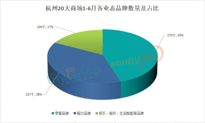 據(jù)聯(lián)商網(wǎng)零售研究中心監(jiān)測(cè)結(jié)果顯示,20家重點(diǎn)商場(chǎng)1-6月總計(jì)引進(jìn)新品牌601個(gè),其中,零售品牌270個(gè),約占比45%,餐飲品牌227個(gè),約占比38%,其他業(yè)態(tài)品牌合計(jì)104個(gè),約占比17%。