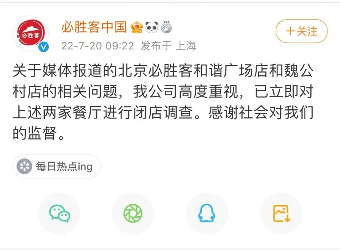 4、必勝客回應(yīng)涉事門店已閉店,監(jiān)管部門已立案