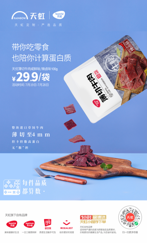 即將上市的天優(yōu)薄切牛肉干,選用牛后腿肉整塊薄切至4mm厚度及合適大小,保證口感適宜又能撕出真實牛肉紋理,通過72小時超過10道嚴格工序,兩次低溫慢烤最大程度鎖住肉汁保留營養(yǎng)。三斤牛肉做出一斤薄切牛肉干,只為給顧客更好的品質(zhì)和口感。