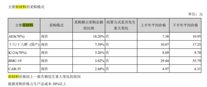 名臣健康也遭遇了同樣的情況,主要原材料價(jià)格在一年內(nèi)持續(xù)上浮,AES、十六/十八醇、K12A、BMC-19、CAB-35等5種原料價(jià)格上漲幅度在0.12%-89.5%,其中BMC-19的價(jià)格接近翻番。