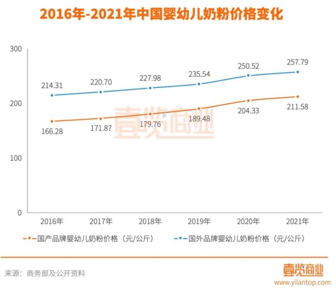 但新生兒用戶的下降,意味著想保持市場規(guī)模,奶粉單價(jià)需要提高。2021年,國產(chǎn)品牌嬰幼兒奶粉的價(jià)格已經(jīng)來到了211.58元/公斤。