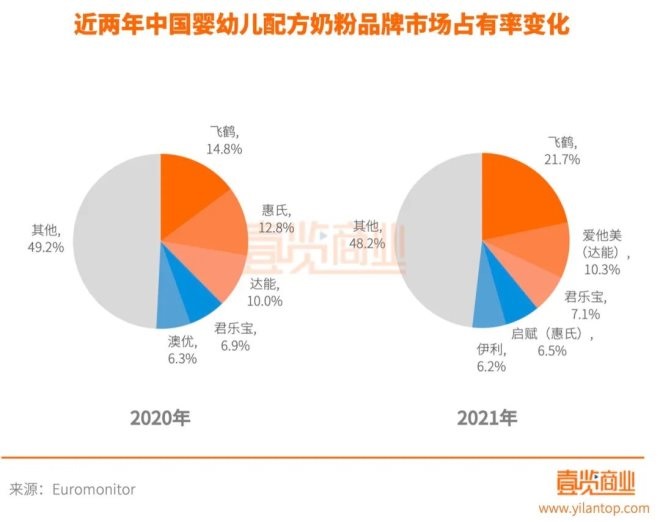 雖然飛鶴也通過收購Vitamin World意欲進(jìn)軍保健品行業(yè),但目前來看,鞏固自身在奶粉行業(yè)的護(hù)城河,進(jìn)一步搶占其他品牌的市場份額依然是飛鶴的業(yè)務(wù)重心。2020年和2021年,嬰幼兒配方奶粉產(chǎn)品占比飛鶴整體營收分別高達(dá)95.06%和94.46%。