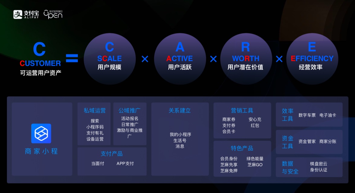 支付寶“C-CARE”模型是商家在支付寶上做精細化用戶運營的整體方案。以用戶價值為中心(C),從擴大用戶規(guī)模(C)、促進用戶活躍(A)、激發(fā)用戶潛在價值(R)和提升經(jīng)營效率(E)4個維度入手,幫助商家解決從獲客、轉(zhuǎn)化、復(fù)購到用戶沉淀的問題,支持商家數(shù)字化的可持續(xù)發(fā)展。
