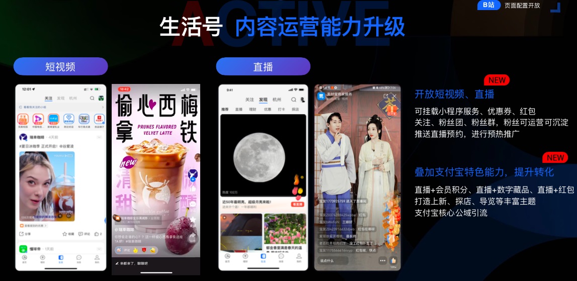 生活號從原來的單一圖文信息,升級為短視頻、直播、圖文等多種內(nèi)容形式,并以信息流展示模式聚合在支付寶App首頁中心位“生活頻道”,支付寶開放這一核心公域流量陣地,旨在幫助商家私域可持續(xù)自運營。