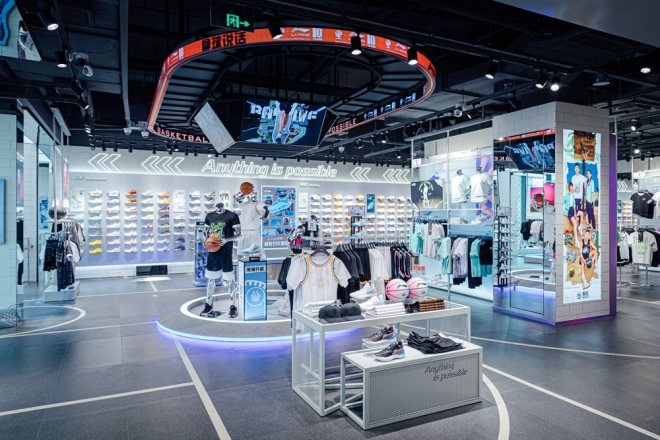 它分為上下兩層,一層為多品類商品陳列區(qū),產(chǎn)品分配彰顯專業(yè)化及人性化,劃分品類區(qū)域依據(jù)產(chǎn)品功能分層擺放,更加貼近消費(fèi)者的需求和感受,讓消費(fèi)者感受到李寧門店的“一站式服務(wù)”;二層設(shè)計(jì)頗具特色,韋德元素和籃球元素隨處可見(jiàn),中間賣場(chǎng)位置,采用天花環(huán)形大屏,結(jié)合下方籃球模特打造籃球主題氛圍區(qū),提升專業(yè)品類的吸引度。