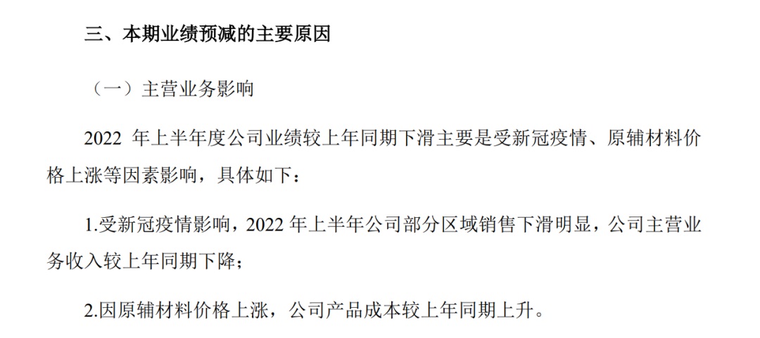 受新冠疫情、物流限制等因素的影響,致使公司經(jīng)銷商渠道、供應鏈業(yè)務、餐飲等終端銷售業(yè)務都受到不同程度的影響,導致公司營收、效益均受到較大影響。
