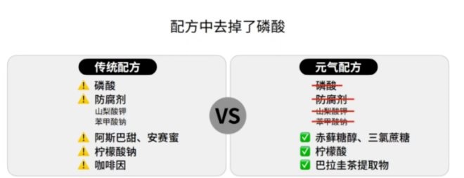 首先,元氣森林大膽去掉了傳統(tǒng)可樂配方中的磷酸。磷酸是影響可樂口味的重要成分,如何保持去掉后口味不改變是件難事。