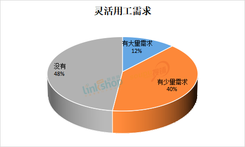3、人力成本是企業(yè)日常經營中最大支出成本之一,疫情之下,不少零售企業(yè)更多考慮精細化運營和開源節(jié)流,靈活用工模式為企業(yè)提供了更多選擇。調查結果顯示,40%的零售企業(yè)在靈活用工方面有少量需求,有大量需求的占比12%,48%的零售企業(yè)表示沒有靈活用工需求。
