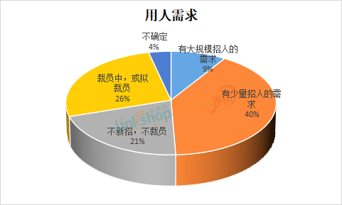 2、相關數(shù)據(jù)顯示,受到疫情影響,零售業(yè)全職從業(yè)人數(shù)占比呈下降態(tài)勢。在用人需求方面,不少零售企業(yè)表現(xiàn)較為謹慎。有大規(guī)模招人需求的零售企業(yè)僅占9%,40%的企業(yè)表示會少量招人,21%的企業(yè)人員會維持現(xiàn)狀,計劃或已經裁員的企業(yè)達到26%。