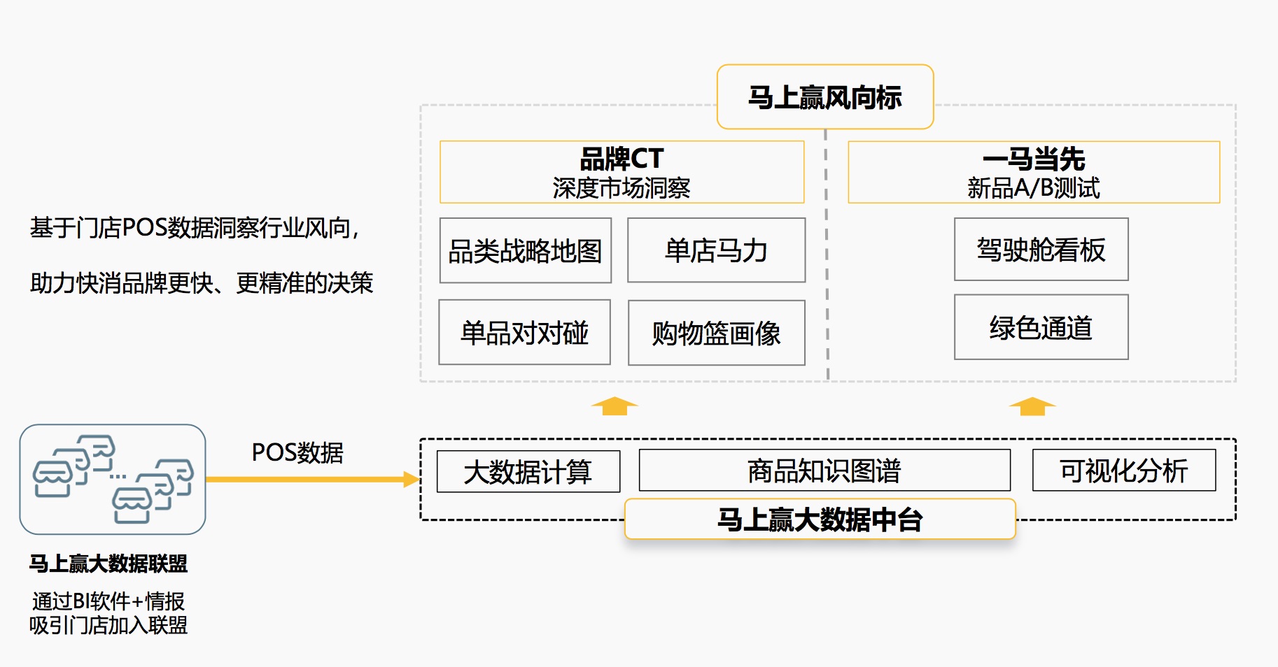 而「馬上贏」通過智能化數(shù)據(jù)分析,可以解決更高效解決企業(yè)的相關(guān)需求。「馬上贏」對接兩端:面向零售商免費(fèi),免費(fèi)提供全國市場情報和大數(shù)據(jù)分析BI軟件等福利,吸引零售商加入馬上贏大數(shù)據(jù)聯(lián)盟,共享POS數(shù)據(jù);面向快消品牌收費(fèi),基于門店P(guān)OS數(shù)據(jù)提供及時、準(zhǔn)確、多維度的線下零售監(jiān)測服務(wù),包括新品情報站、單品對對碰、單店馬力、品類戰(zhàn)略地圖、價格監(jiān)測、購物籃畫像等。