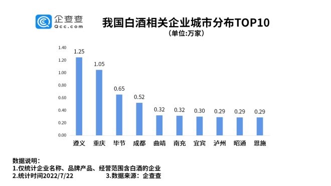 企查查數(shù)據(jù)顯示,從城市分布來看,遵義以1.25萬家白酒相關(guān)企業(yè)排名第一。重慶、畢節(jié)分別有白酒相關(guān)企業(yè)1.05萬家、0.65萬家,排名前三。此后依次為成都、曲靖等城市。