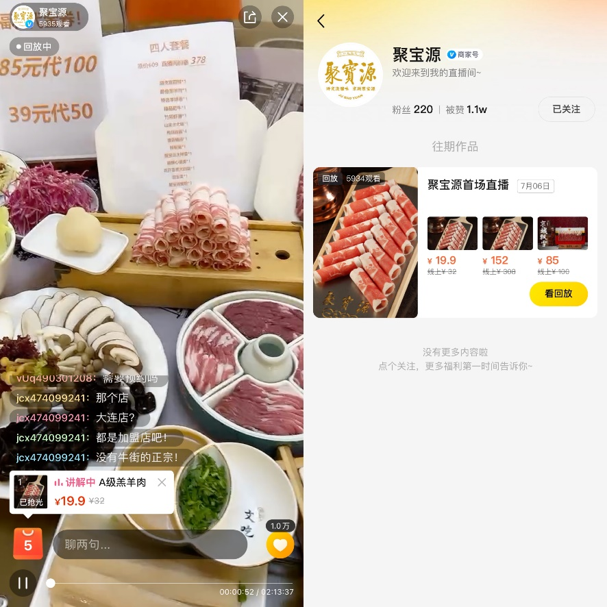 觀看人數(shù)少、漲粉慢,這種情況也同樣發(fā)生在其他美團(tuán)商家的直播間。北京老字號(hào)餐飲商家聚寶源,在7月6日開啟首場(chǎng)直播。購(gòu)物車鏈接掛上5件商品,從最低19.9元的單品秒殺,涵蓋最高378元四人套餐的代金券,均需到店核銷使用。