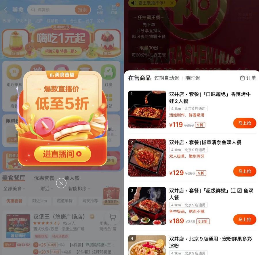 36氪未來消費(fèi)注意到,在美團(tuán)APP首頁的“美食”欄目中,為“美團(tuán)直播”進(jìn)行彈窗推送,點(diǎn)擊可進(jìn)入商家直播間。在近日一次推送中,美團(tuán)直播以“爆款直播價(jià)”“低于5折”的醒目字眼為商家直播間導(dǎo)流。