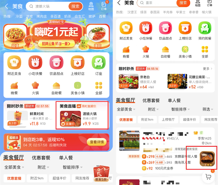 商家推出限時(shí)低價(jià)吸引粉絲觀看,美團(tuán)則以“精選美食直播”“直播價(jià)4折起”等廣告入口為商家導(dǎo)流,直播間提供的代金券產(chǎn)品并非到店使用,而是用于外賣和自提。