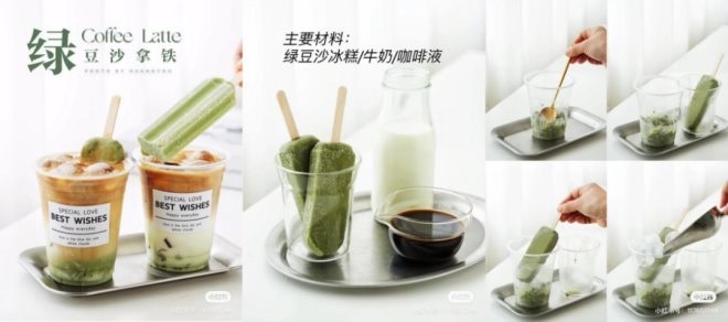 不過,光是綠豆,還不夠滿足人們對新鮮感、豐富感的追求。為了滿足食客的味蕾,商家紛紛推出綠豆和奶、茶的搭配。牛乳、椰奶、茶、咖啡,都成為綠豆的飲料底。
